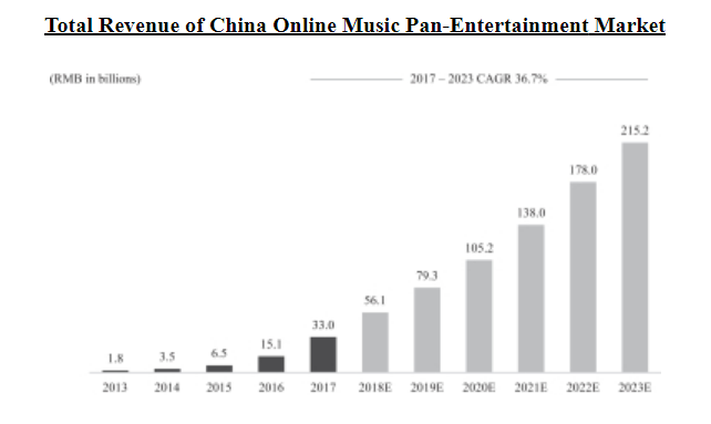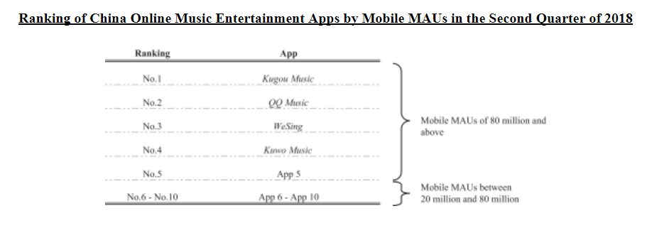 根据iResearch的数据,2017年市场中国在线音乐泛娱乐市场规模约为330亿元人民币,2023年有望增长至2152亿元人民币,从2017年至2023年的CAGR为36.7%。在整个在线音乐泛娱乐市场中,在线音乐服务、在线卡拉OK、以音乐为中心的直播、在线广告和在线音乐版权业务共同构成了一个充满活力的市场,使中国消费者能够以多种方式参与音乐活动,包括音乐发现、聆听、观看、唱歌和社交活动。截至2018Q2,腾讯音乐旗下四款音乐娱乐APP按月活跃用户计算,占据整个行业的前四名,寡头地位显著。