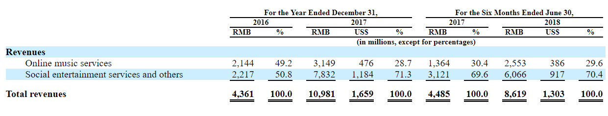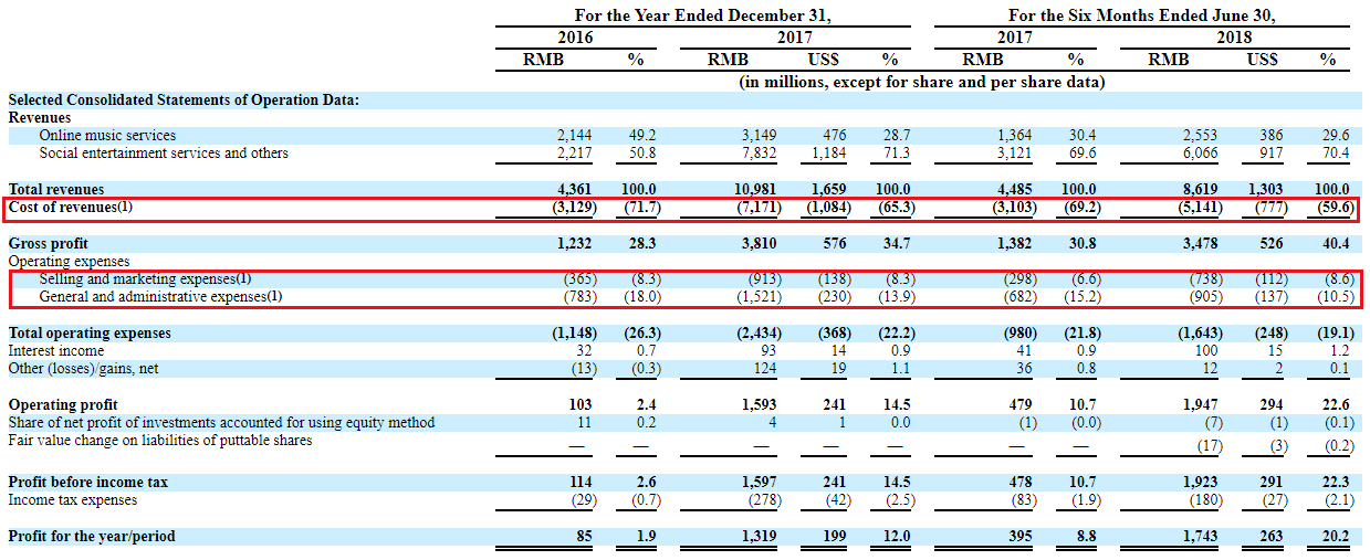 营收快速增长,社交娱乐业务势头凶猛。2016、2017、2018H1,腾讯音乐分别实现营业收入43.61、109.81、86.19亿元,2017、2018H1的同比增速分别为151.8%、92.2%。其中,2016、2017、2018H1在线音乐服务业务的营收占比分别为49.2%、28.7%、30.4%,而社交娱乐服务及其他的营收占比则从2016年的50.8%,进一步上升到2018H1的70.4%,成为贡献营收的主要力量。可见在合并以音乐直播为强项的CMC(酷我、酷狗)之后,腾讯将其在社交上的传统优势充分放大。