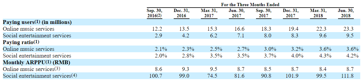 付费用户的增长是主要驱动,ARPU保持平稳。2016Q3至2018Q2,腾讯音乐付费用户的ARPU基本保持平稳,在线音乐服务业务保持在月均9元,社交娱乐服务业务保持在月均100元上下。但付费用户方面,在线音乐服务从1220万人上升到2330万人,社交娱乐服务从290万人上升到950万人,增长势头强劲。