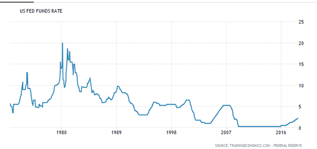 笔者认为,上述四个原因都不影响市场基本面,所以投资者无需对持有股票过于担忧。首先,美国利率上升是美国经济健康发展的标志;其次,本次利率上升造成恐慌时,实际利率仍然接近历史低地位,公司仍能够以低利率贷款并获得可观的回报。下图展示过去50年的联邦基金利率: