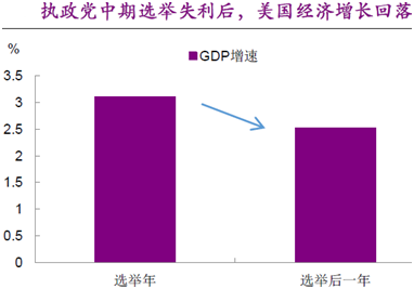 历史经验表明,自1980年以来,每当执政党中期选举失利,次年美国GDP增速平均下降0.6%,但未曾出现经济陷入衰退。但是,这几次的经济回落不能简单归结于中期选举失利。