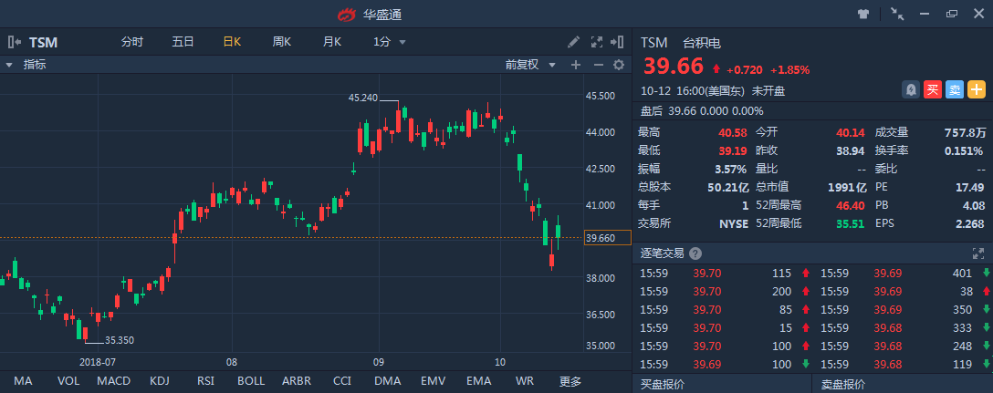 图8:按18.60倍的市盈率,预测得出每ADR盈利2.15美元,台积电公允价值为39.95美元。