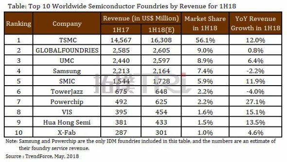 作为全球半导体行业最大的晶圆代工公司,台积电在手机、个人电脑、消费和工业领域的芯片制造和供应方面占据主导地位。台积电是许多大型无晶圆厂半导体公司(专注于设计而非制造的芯片公司)的首选合约制造商,如苹果、高通、AMD、Nvidia甚至比特大陆等比特币挖矿公司。根据TrendForce预测,以收入计算公司在2018年上半年占全球晶圆代工市场的56.1%左右,具体见下图。这一主导地位使公司在与众多无晶圆厂客户谈判时处于有力地位。