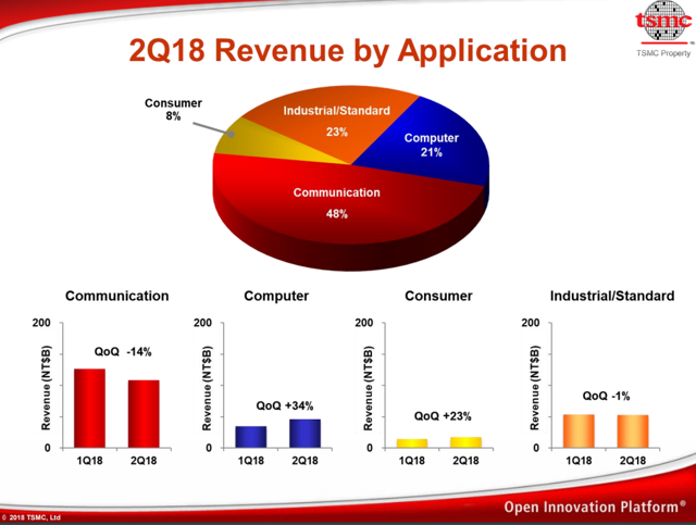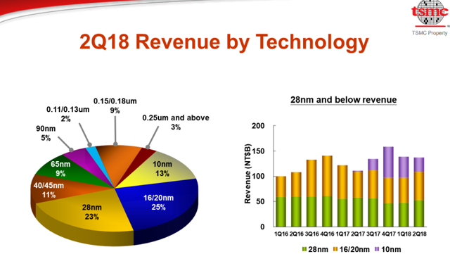 图4:截至2018年第二季度,台积电的收入仍主要靠16/20/28纳米的驱动,7纳米的影响尚未到来