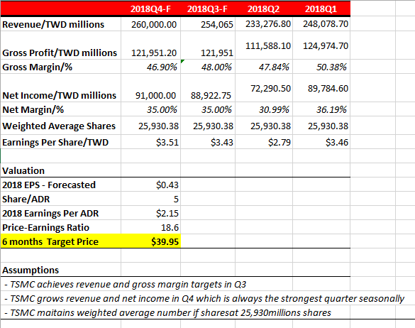 公司第三季度营收预计为84.5-85.5亿美元,毛利率在45-50%之间。第四季度是公司是每年收入最强季,因此预计2018年下半年营收和利润都将增长。同时,在估值和目标价计算中,采用35%的历史平均净利率。