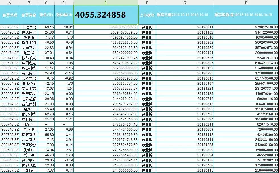 另外,在2015-16年左右,在股价高企时,创业板公司进行大量的增发,如今这些增发的限制性股票都面临解禁。而今年上市的许多庞然大物的首发股份也都在未来一年面临解禁,创业板未来一年解禁金额高达4,055亿(未算新上市的迈瑞医疗)。