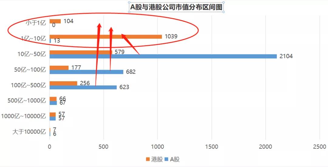 比较A股和港股市值分布,我们看到,港股公司数量集中在小市值区域,尤其是1-10亿中。而A股目前公司集中在市值10~50亿的范围。如果将来更多公司业务掏空、市值萎缩、投资价值下降,那么就会向港股的市值分布靠近。