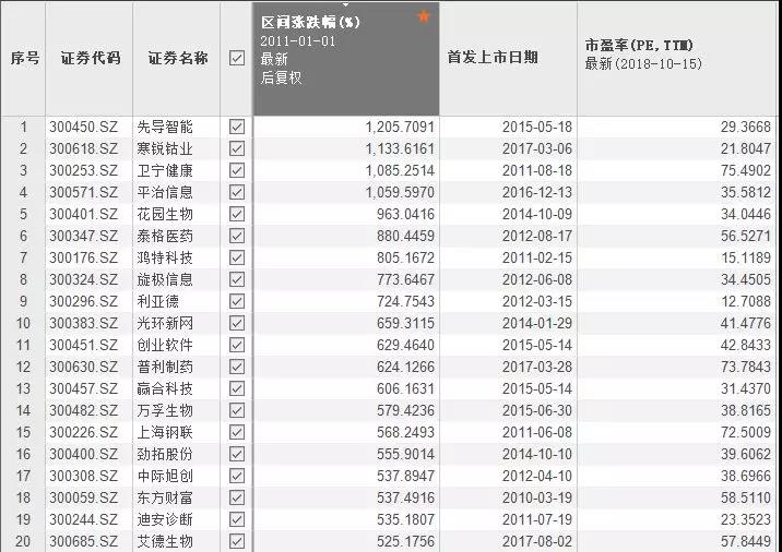 资料来源:choice,创业板上市至今股票涨幅排行(剔除上市时间不长没有经历大解禁的次新股),里面没几个算是中国科技创新的领军企业,骗子和庄股倒是不少