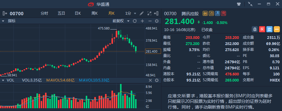 受游戏管控增强、公司业绩遇冷以及人民币汇率下跌等多重不利因素影响,腾讯股价进入拐点,今年以来的股价持续下跌,10月16日收盘价为281.4港币,距年初475.58港币的最高点下跌了40.8%,市值严重缩水。尽管过去十年腾讯给投资者带来了不菲的收益,但是最近的业绩不佳及股价大跌开始让投资者怀疑腾讯未来的增长潜力,那么腾讯真的要没落了吗?