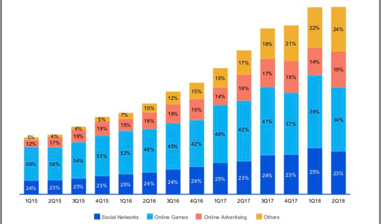 游戏管控增强对腾讯、网易等的游戏业务将会带来不利,同时也是很多投资者看空腾讯的原因之一。但是游戏在腾讯总收入中的占比在不断减少,由2015年一季度的59%逐渐下降到2018年二季度的34%,并且随着腾讯其他业务的收入增长还将会不断减少,未来游戏只是腾讯诸多支柱产业中的一支。