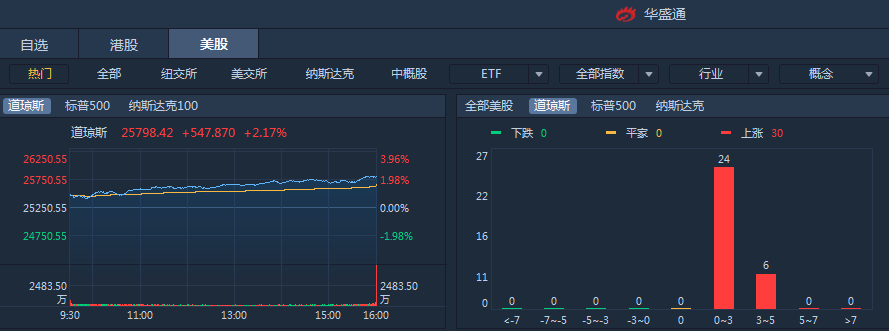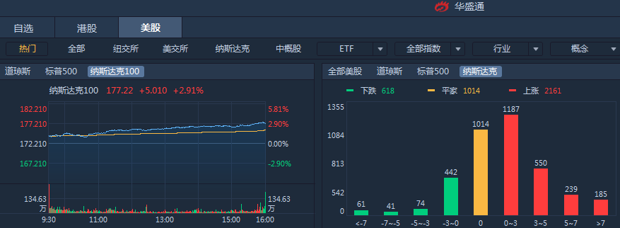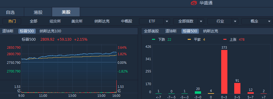 周二美股大幅反弹,科技股领涨,标普500指数收涨2.15%,道指收涨2.17%,纳指收涨2.89%。