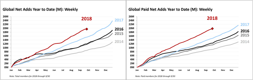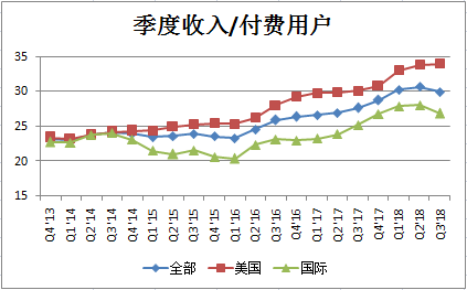 从内容上看,奈飞进一步加大了在原创剧集的投入,第三季度新增内容支出32亿与上个月基本持平。考虑到诸如迪士尼将在年底停止合作及第三方版权竞争等不确定因素,奈飞仍然在非常积极地进行原创剧集的投入,公司将在新墨西哥州建立了新的制作中心,预期未来10年将投入10亿美元。