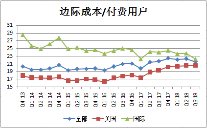 从季度收入/付费用户,即客单价来看,整体水平出现了一定下滑。对此公司的解释是汇率变动的原因,而如果除去这一影响,公司的国际用户客单价将按季度提升2%。从整体的趋势上看,用户单价的变化正趋于平稳,而随着未来潜在竞争加剧,提价空间也会变得有限。显示未来订阅用户的增长将仍然是市场关注的焦点。