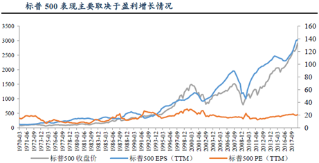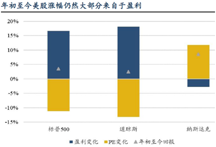 经过今年以来的两次大幅回调,加上盈利的持续提升,美股当前的整体绝对估值水平在20倍左右PE,回归相对合理区间。通过下图可以看出,除了纳斯达克,道琼斯和标普500的年初至今回报均来自盈利增长。