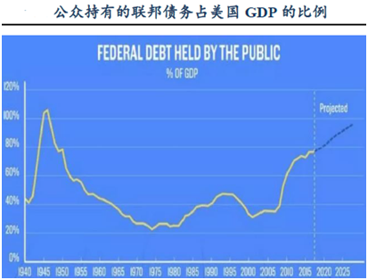在公众债务方面,根据美国国会预算办公室估计,公众持有的联邦债务占GDP的比例,将从今年年底的78%升至2028年96%,这将是1946年以来最高水平。