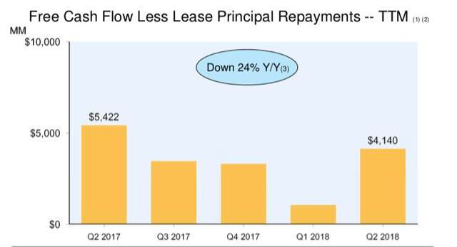 公司目前市值与12个月滚动收益的比率仍为141倍,同时调整资本支出后,公司自由现金流显得相对较小。由于公司经常通过融资购买财产和设备,所以需要定期偿还贷款的本金。如果将这些支出从常规费用算到资本支出费用,可看出公司的自由现金流呈逐年下降趋势: