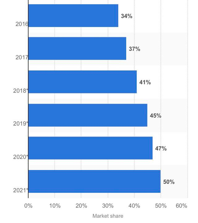 下图所示,预计到2021年公司将占美国电子商务销售总额的一半: