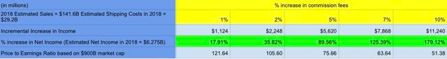 公司可能无法将佣金增加5%。由于目前佣金已达到10-15%,额外增加5%可能会使卖家转移到其他电子商务网站。但笔者也想相信公司能够通过在卖家、买家(例如通过亚马逊Prime费用)和物流效率之间传递成本,进而从每笔交易中额外获得5%以上的收益。此外,公司目前重视平台黏性,所以不会轻易提高佣金比率。