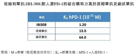 信迪利单抗IBI-308有望成为全球同类中最佳的PD-1抗体。影响抗癌药物临床疗效的最重要的因素是抗体以足够强度及持续时间与靶点结合的能力。体外研究表明IBI-308的结合亲和力比已上市的纳武单抗派姆单抗分别高出约10倍及50倍。此外,从延长结合能力、良好安全性及临床观察功效而言,IBI-308均有不错表现。