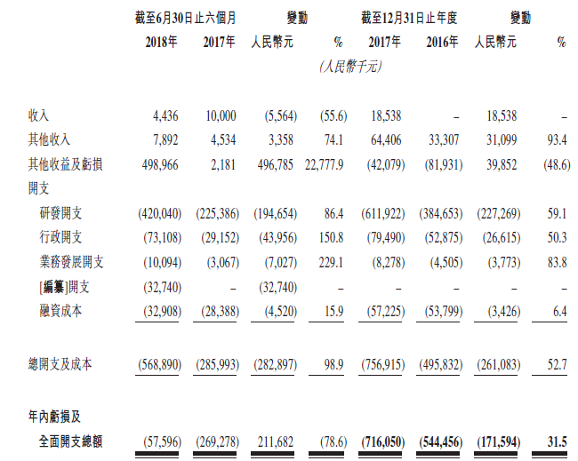 目前主要通过银行贷款及股权融资提供运营资金,研发活动为业务重点,公司2016年和2017年研发开支分别为3.85亿元、6.12亿元,占总开支及成本的77.6%和80.8%,其次,过去两年公司没有产生销售或市场推广费用,预计2018年底公司成立销售及市场推广团队,并产生相应开支。
