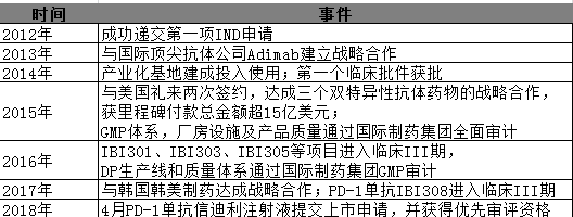 产品管线方面,17种单抗药物中有2个品种入选国家“重大新药创制”专项,10个品种进入临床研究,4个品种进入临床III期研究,1个产品提交上市申请。目前有7种药物在中国处于临床开发阶段,其中拥有全球化专利的4种核心产品在中国已进入后期临床开发阶段,包括公司新型的PD-1抗体信迪利单抗(IBI-308);贝伐珠单抗(阿瓦斯汀)生物类似药IBI-305、利妥昔单抗(美罗华/ Rituxan)生物类似药IBI-301和阿达木单抗(修美乐)生物类似药IBI-303。