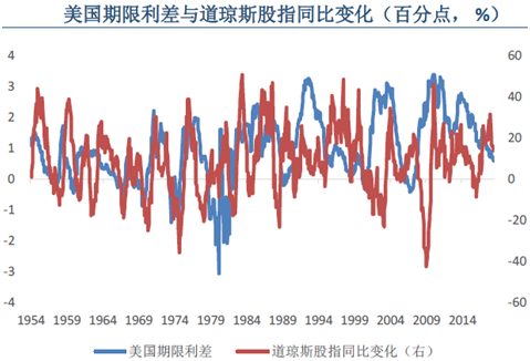 当利差接近0或者为负时,通常会出发股市大幅度调整。1950年以来美国出现的10次利率倒挂中,道琼斯指数无一例外都出现了大幅下调,平均最大下跌幅度为同比21.2%。大多数情况下,利差触底领先于估值调整底,在这10次中共出现了8次,只有2次股市调整遭遇利差底。