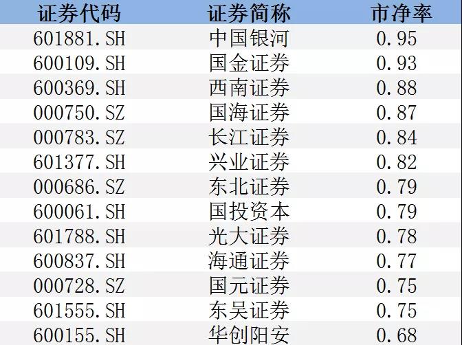 实际上,一大批券商股早已破净。在国庆假期之前,32家A股上市券商中,有6家公司的股价低于每股净资产,分别是海通证券、光大证券、东吴证券、兴业证券、国元证券和东北证券,其中海通证券、东北证券的PB不到0.9,估值堪比常年“破净王”银行股。