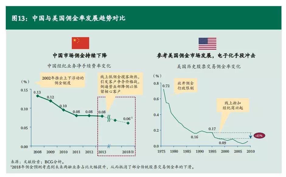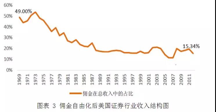 自1975年美国证券业放开经纪业务佣金价格管制后,券商业的佣金费率就一路走低,从1975年的0.72%下降至1995年的0.17%,1995年之后,美国互联网折扣券商加入佣金大战,券商佣金费率又继续下降了41%,直到近几年才稍有稳定。