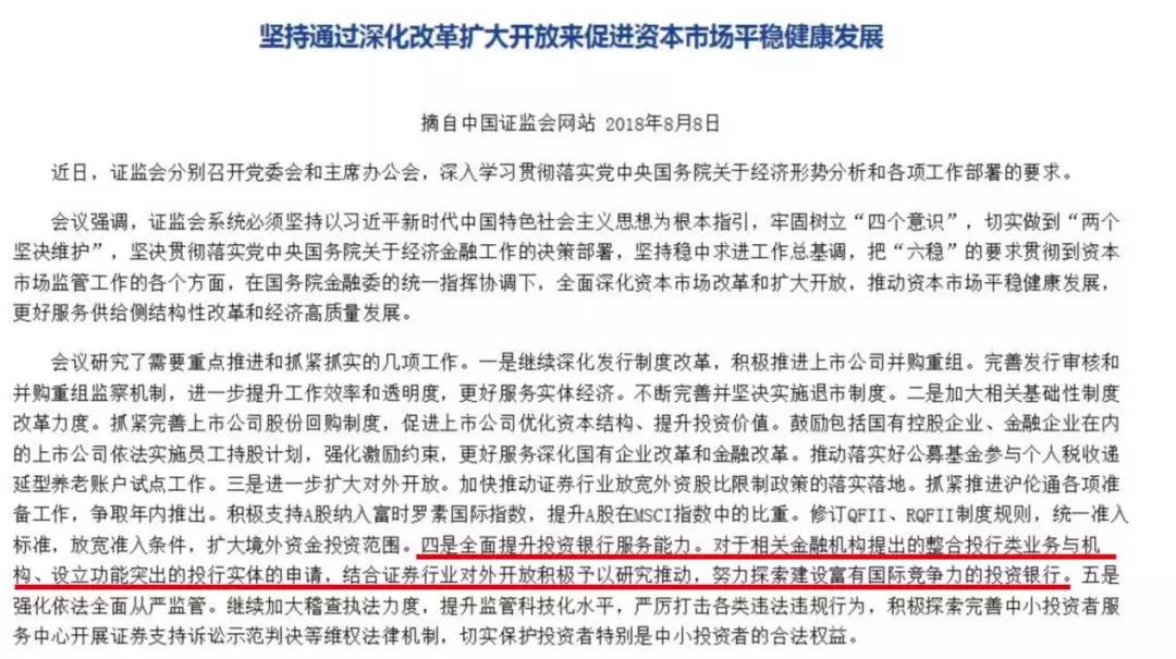 除了外资券商的抢食,大型银行系券商也可能加入券商战局。今年8月份,证监会召开主席办公会,安排部署扩大资本市场对外开放的五条举措,其中第四条举措值得高度关注:全面提升投资银行服务能力。对于相关金融机构提出的整合投行类业务与机构、设立功能突出的投行实体的申请,结合证券行业对外开放积极予以研究推动,努力探索建设富有国际竞争力的投资银行。