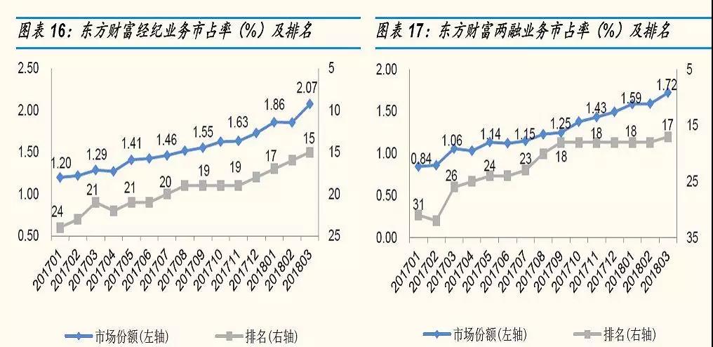 三年间,经纪业务、两融业务同业排名从垫底分别快速提升至第15名、第17名,且排名还在迅速提升。2018年前三季度,东方财富可能是A股券商中唯一保持业绩正增长的券商股。