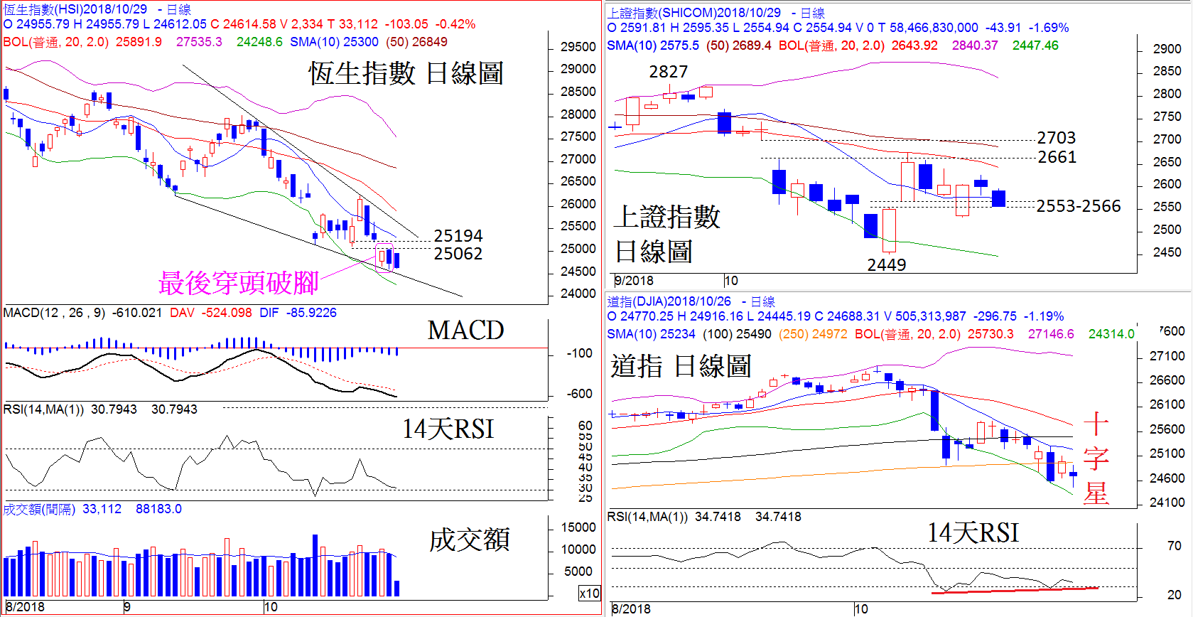 從日線圖看,恆指上周在25062至25194之間留下一個下跌裂口,除非先重返其上高收,否則,弱勢將持續下去。事實上,MACD在「吻別」的情況下回復沽售訊號,顯示跌市迄今仍未有任何見底跡象。支持方面,由9月12日低位26219延伸的「下降楔形」底線今日大約在24500點,成為短線較強力的支持。