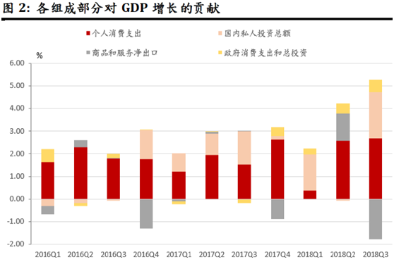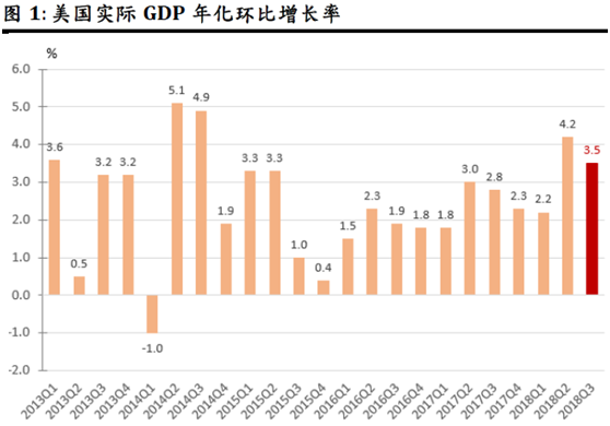 美国经济分析局于10月26日公布了美国第三季度经济增长的首次预估值。数据显示,美国三季度实际GDP年化环比增长3.5%,相较于二季度的4.2%稍有回落,但大致符合市场预测的3.3%。实际GDP的增长主要反映了消费者支出和库存投资的激增。总体而言,美国经济仍在稳步增长,预计2018年全年GDP增速大约在3%。