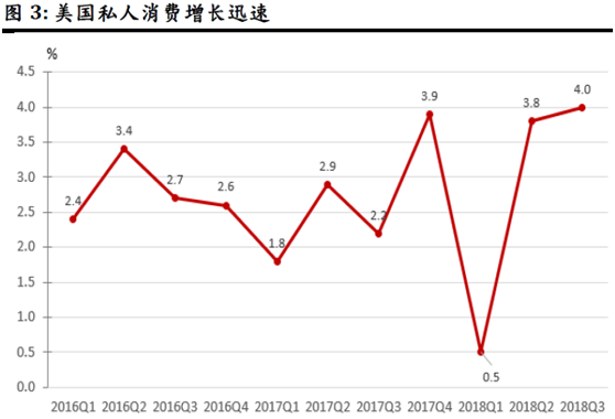 第三季度个人消费支出年化季环比增长4%,贡献了超过七成的GDP增速,为4年来最强增长。零售市场的畅旺反映去年底通过的减税法案依然在刺激经济。随着失业率持续保持在低位以及消费者信心的不断改善,预计美国零售商在即将到来的假日季将有亮眼表现。