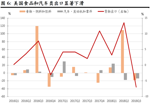 美国实际净出口在第二季度对GDP产生了积极的拉动作用,到第三季度迅速转变成为主要拖累项。虽然进口依旧保持平稳增速,但出口出现明显萎缩,拖累GDP增长0.45个百分点。多个品类的商品出口出现大幅下滑,其中食品类和汽车及配件类分别下降18.5%和14.1%。以大豆为例,受到中美贸易纠纷的影响,截止10月25日与上个销售年度相比,美国对中国的大豆出口量下降了97%。前瞻地看,持续拖延的贸易纠纷和强势美元预计将进一步损害美国出口表现。