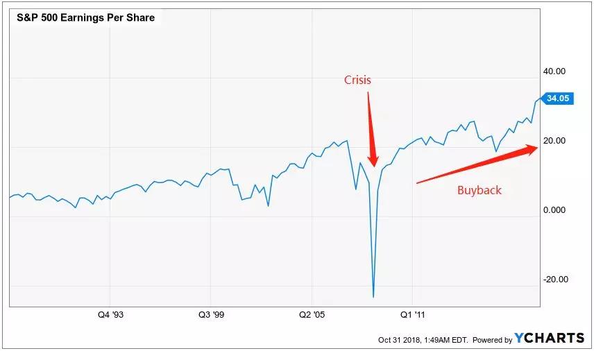图片来源:Ychart;标普500指数每股盈利。2008金融危机之后,随着股票回购,每股盈利持续上升