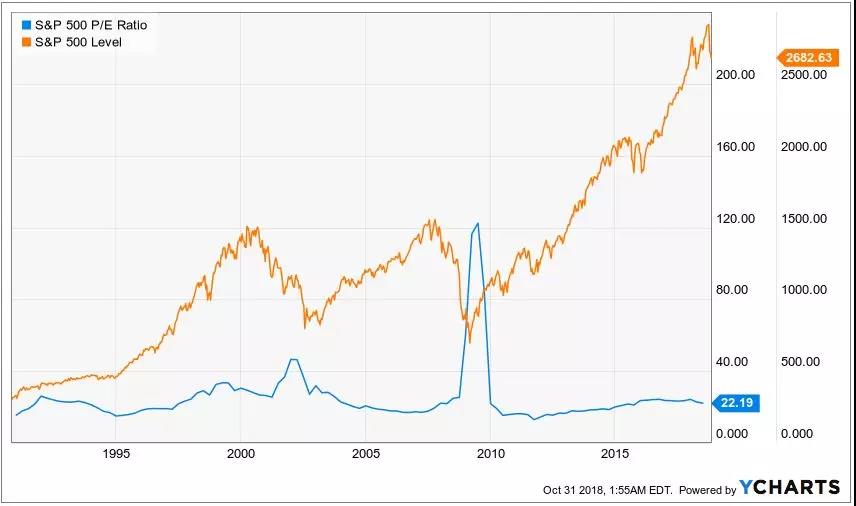 图片来源:Ychart;标普500指数与市盈率,1990~2018。图中可见自2009年每股见底复苏之后,指数涨幅高于市盈率涨幅