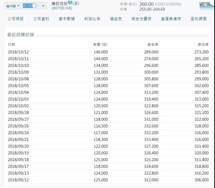 图片来源:aastocks阿斯达克股票网;腾讯三季度回购详情