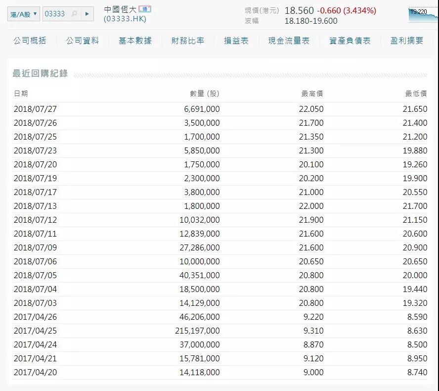 图片来源:aastocks阿斯达克股票网;中国恒大前三季度回购详情