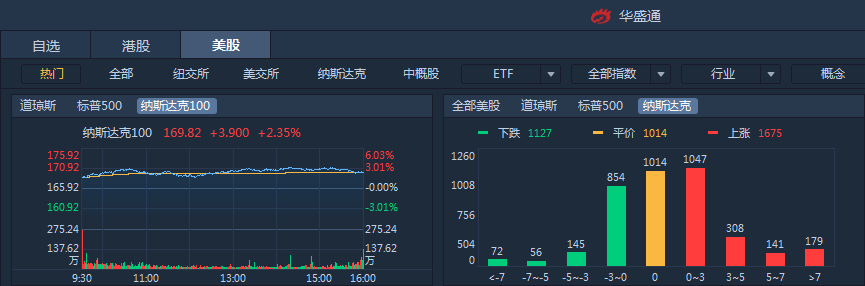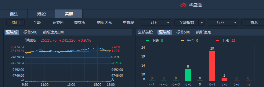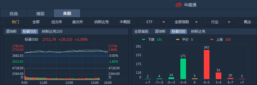周三美股大型科技股表现出色,三大指数全线收涨,标普500涨幅1.09%,创2月份以来最大连续两天涨幅,道指收涨0.97%,纳指上涨2.01%。