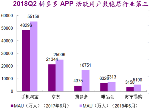 拼多多最近两年一月成为第三大电商品台:在活跃用户数量方面,年度活跃买家超过3.4亿,移动端MAU高达1.67亿,从用户规模角度看拼多多已经稳居电商行业第三,仅次于阿里与京东,与唯品会、苏宁易购等同行拉开差距。