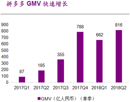 公司18Q2财报显示,拼多多截止2018年6月的12个月总GMV达到2621亿人民币,其中2018Q2单季度GMV816亿元,相当于阿里巴巴GMV总规模的6%。