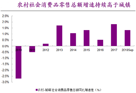 由于城市化水平的持续提高以及近年来棚户区改造的财富效应,低线城镇消费潜力正在逐步释放。从社会消费品零售总额数据来看,虽然目前各方对一二三四线城市的划分并没有达成完全的共识,但我们选择了大家争议较少的北上广深作为一线城市样本,将北上广深社会消费品零售总额增速与城镇及农村整体增速对比发现,2011年开始北上广深消费增速持续低于城镇及农村增速,至2016年分别落后城镇及农村增速2.3及2.8pct。