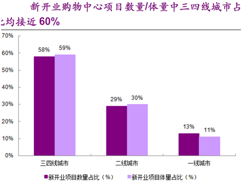 低线城镇线下商业供需失衡的情况在购物中心新开业项目数据层面也能够得到间接佐证,有数据表明,2017年全国接近60%的新开业购物中心项目集中在三四线城市。