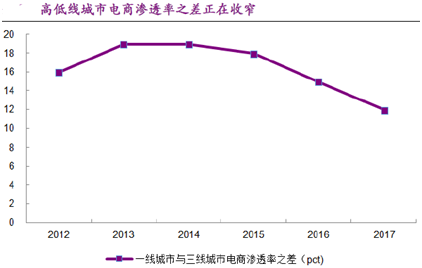 根据数据显示,2017年一线城市电商渗透率高达73%,领先二三四线城市大约2-3年,而五线城市电商渗透率仅50%,仍然存在巨大的市场空间。从近年的趋势上看,一线城市与三线城市的电商渗透率之差已经从2013年的19pct迅速收窄至12pct,低线城镇的电商需求正在加速释放。