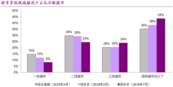 从用户数据层面,2018年7月拼多多在三四线城市及以下区域用户比例高达68%,比其他综合电商高出13pct。公司采取社交裂变的方式,在微信生态资源的支持下,打开电商下沉市场。