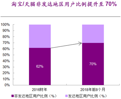 从阿里的数据可以看出,全平台活跃用户增速从2014年开始下滑,至2017年中下降至10%以下;然而从2017Q3开始阿里活跃用户增速连续4个季度出现恢复,最近2018Q2提升至23.6%,阿里巴巴管理层也在业绩报告中奖其归因于农村及低线城市渗透率的提升。