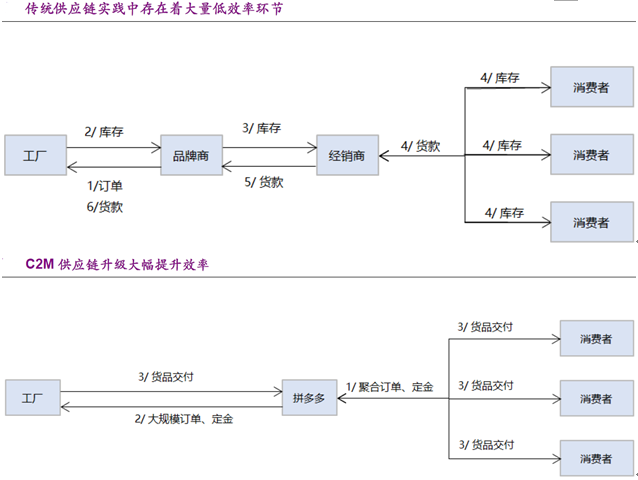 拼多多更大的未来在于可规模化的C2M供应链改造。C2M即“客户到工厂”的供应链升级。通过平台将用户的需求集中统计,以批量化订单的形式直接向工厂下大规模订单,从而实现某种意义上的反向定制。在供给端,工厂由于订单的规模效应以及需求的确定性,因此不必承担存货风险,能够给出较大幅度的折扣价格;在需求端,用户能够以优惠的价格获得理想的商品。