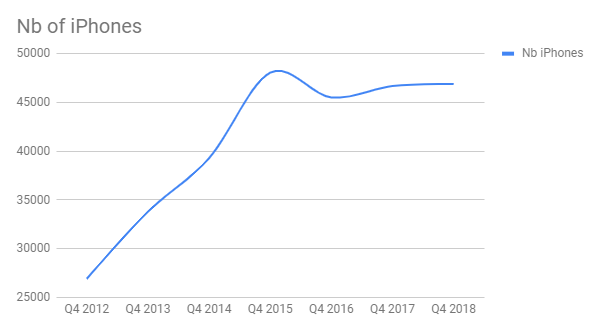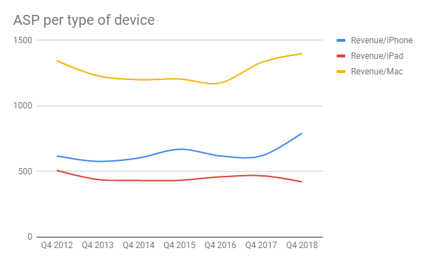 与上季度的情况一样,iPhone的销售收入增长速度令人印象深刻,但是销量却停滞不前。这是由于新发布手机的过高定价造成的。如下图所示,自2016年以来,iPhone销量一直停滞不前。而从2017年开始,iPhone开始进行提价,这可能暴露了iPhone销量难以提升而不得不通过提价来提高收入的困境。