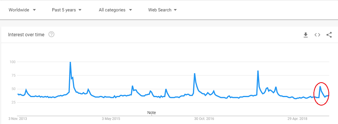 而管理层对不再从产品层面作报告的解释是其与财报结果相关度不大,但实际上更可能跟产品销量不佳有关。根据谷歌流行趋势,iPhone可能会不再像以往那么受欢迎,如下图所示,峰值时刻为iPhone新品发布时间,今年的新品受关注程度相比前几次明显有所下滑。