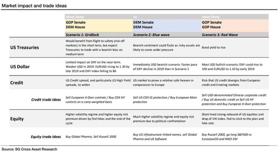 法兴补充称,还有一种情况是民主党大获全胜,控制参众两院。法兴称这种情况是“蓝潮”。这种情况下,现有经济政策会延续,但推进速度会放缓,尤其是贸易争端、“税改2.0”,以及美国对外参与国际事务的态度。特朗普将变成“跛脚鸭”总统,尽管他可能会利用总统权力强行推动某些政策,但其面临的被弹劾的风险也提高。